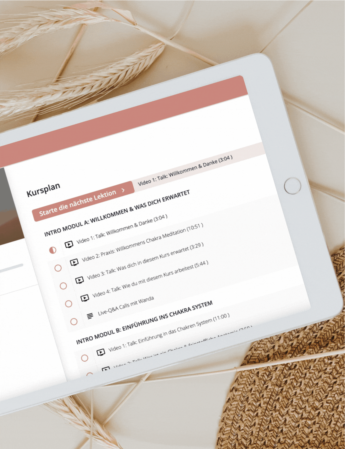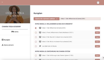 Da die sieben Chakren aufeinander aufbauen und es entscheidend ist, ein solides Fundament zu legen, startet der Kurs mit Einführungsmodulen, wertvoller Yoga-Philosophie und faszinierendem Hintergrundwissen über die Chakren sowie über deinem ersten Chakra. Um sicherzustellen, dass dich die umfangreichen Inhalte dieses Kurses nicht überwältigen, wird nach dem Erwerb des Kurses alle zwei Wochen ein neues Modul freigeschaltet.