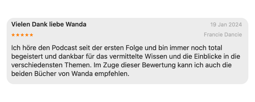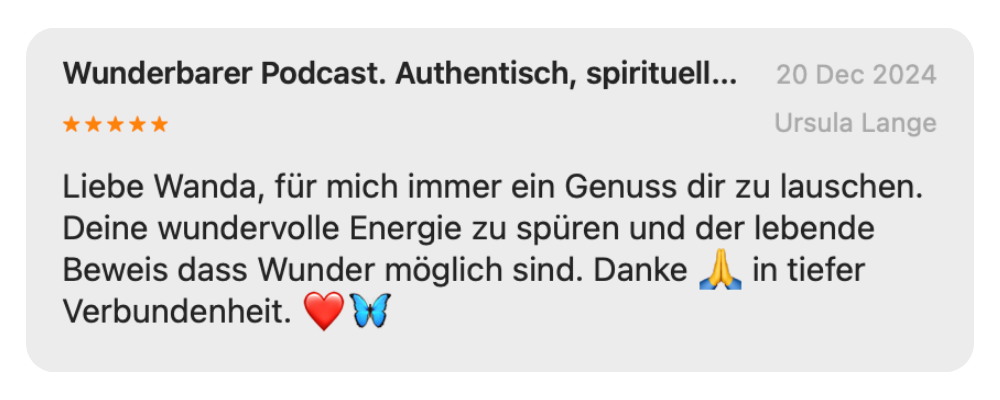 Mit ihrer klaren, frischen Stimme für die moderne spirituelle Bewegung inspiriert Wanda Menschen, ihre eigene Wahrheit zu entdecken – und Spiritualität nicht nur zu denken, sondern zu leben: echt, alltagstauglich und mit offenem Herzen.