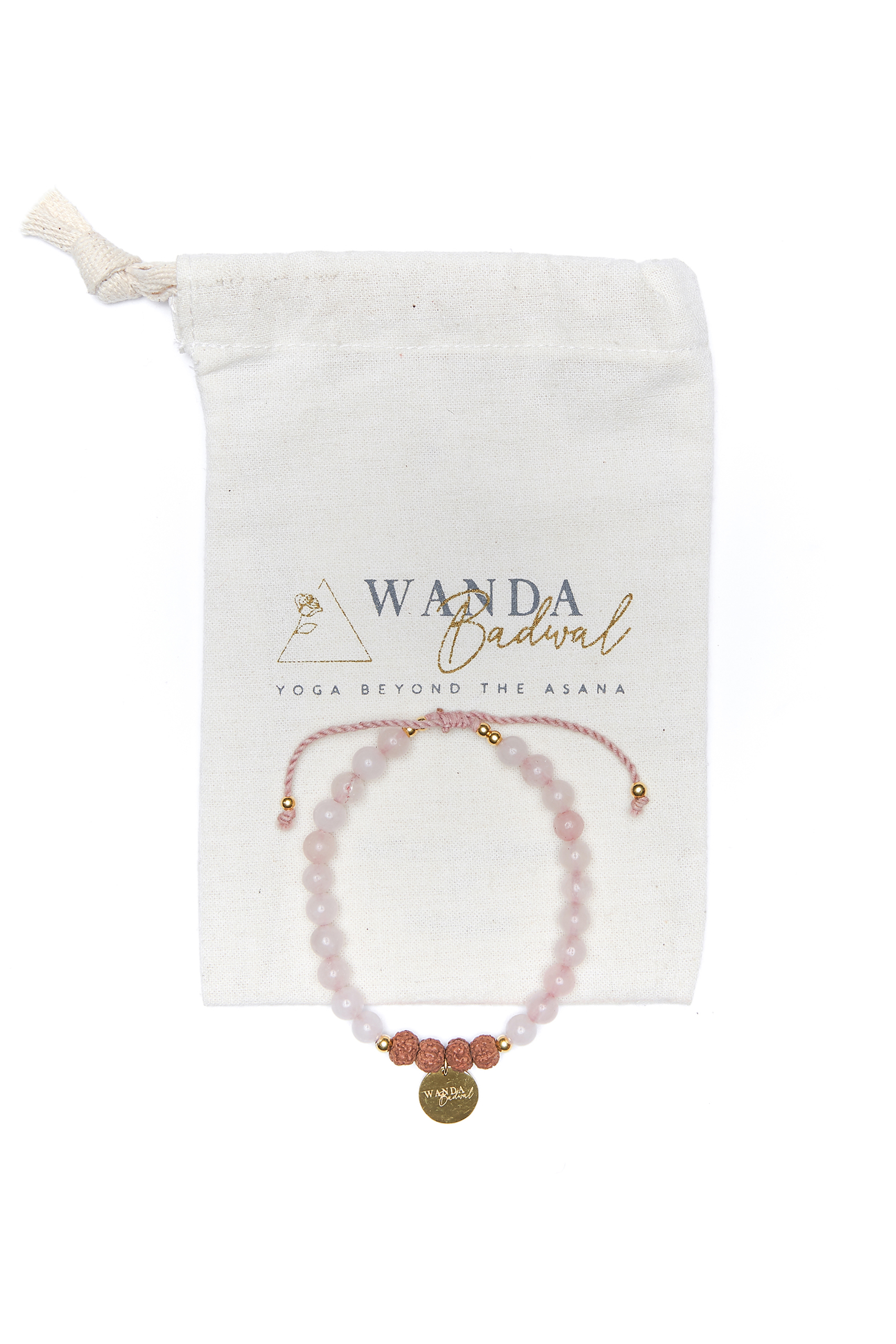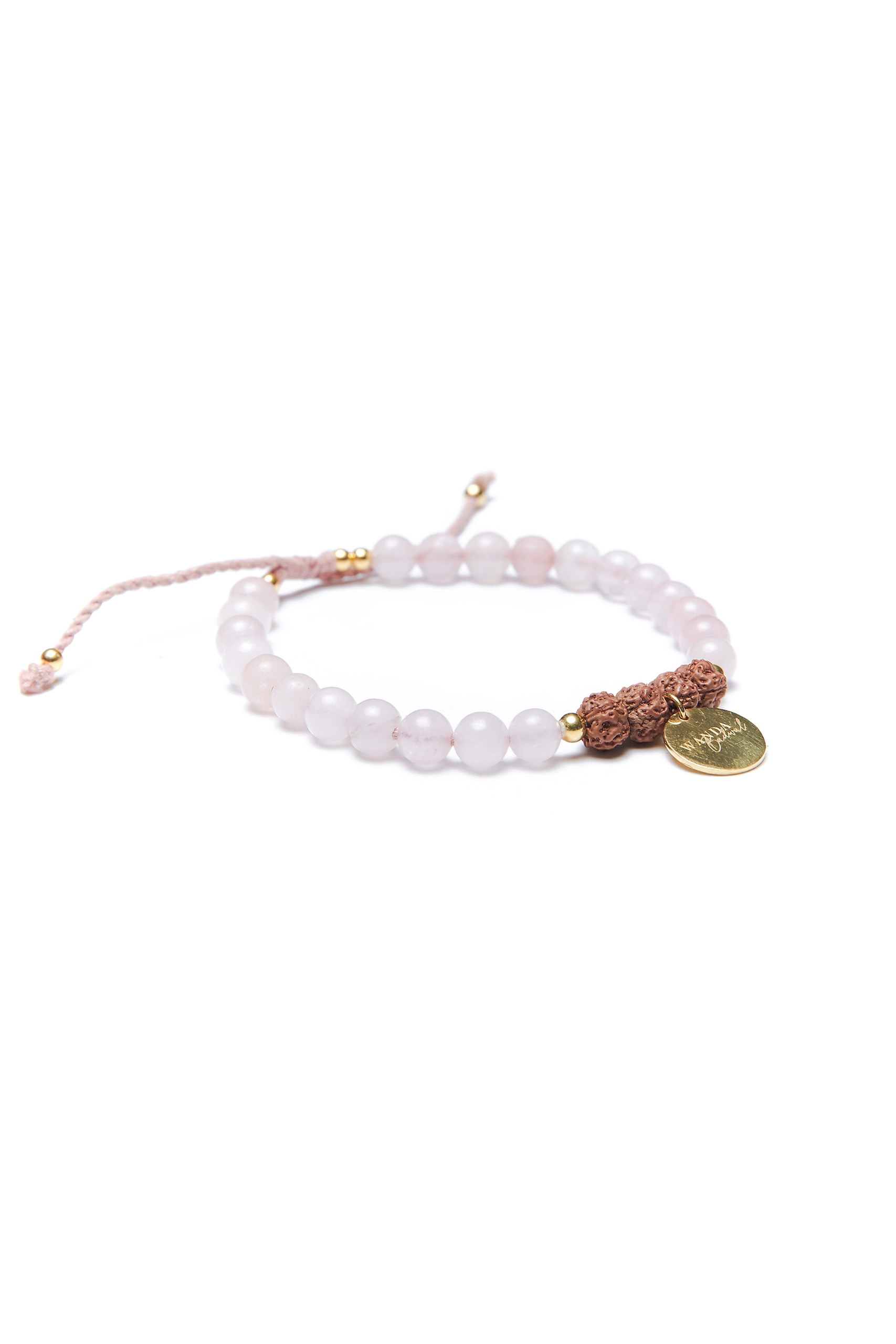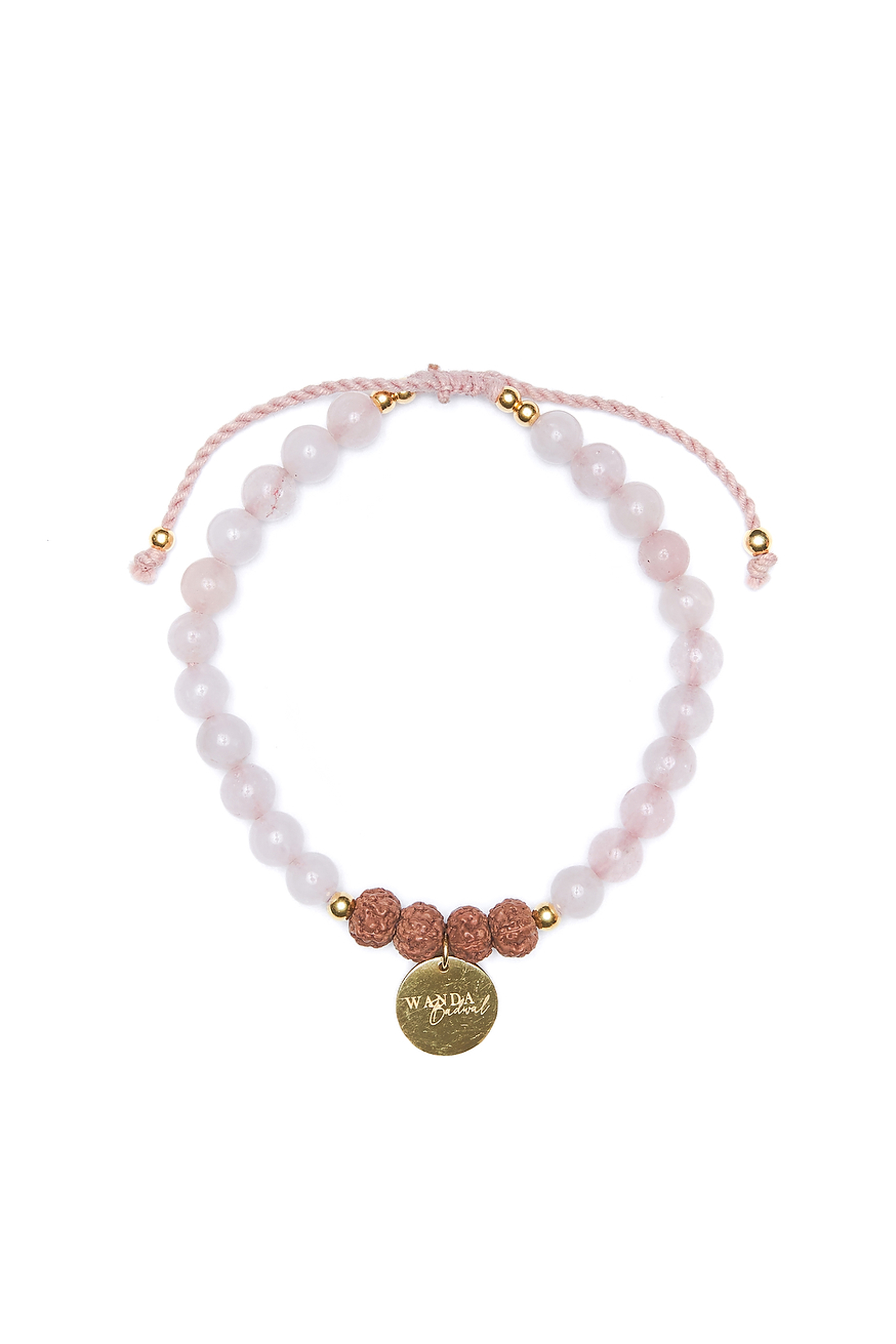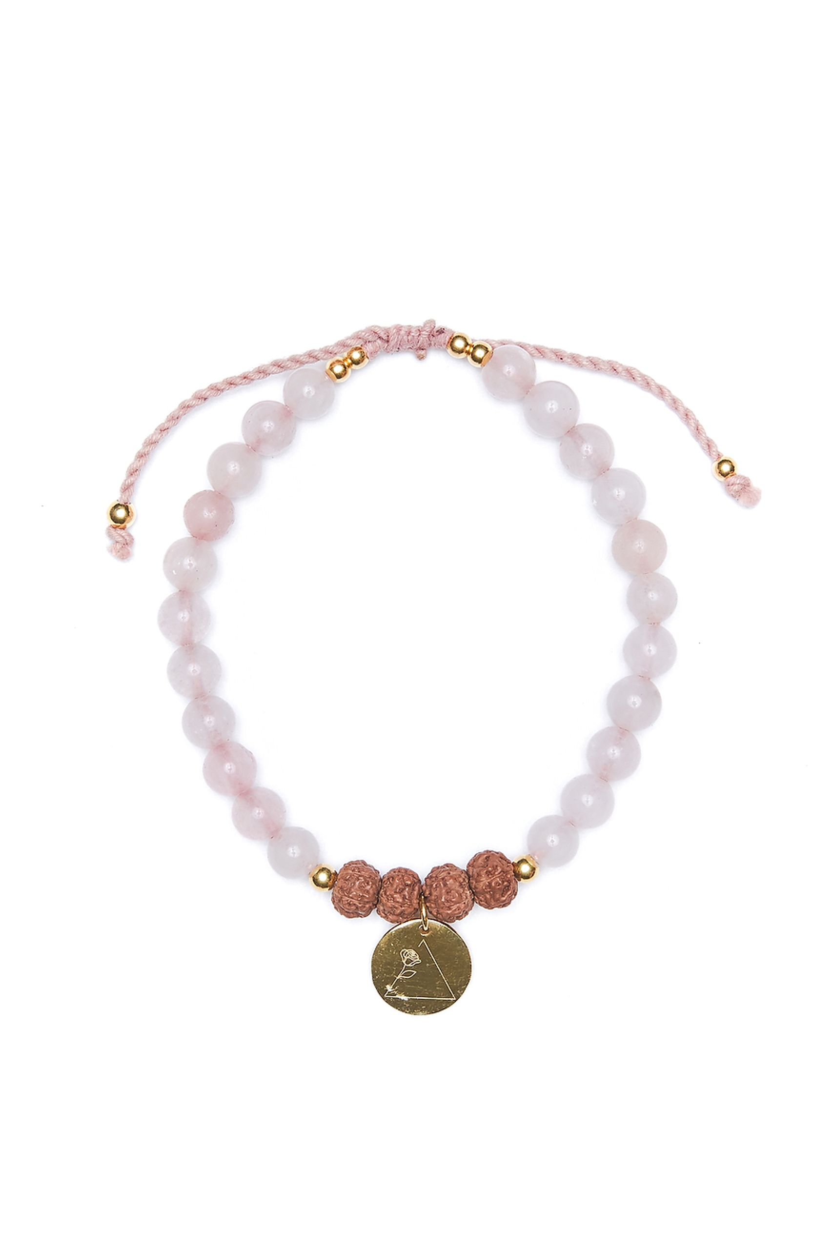 Materialien: Rosenquarz, Rudraksha-Samen, Messinggold, Bio-Baumwollfaden, sichere gesunde Pflanzenfarben, faire Produktion in Frauenbesitz, hergestellt in Bali, Indonesien.