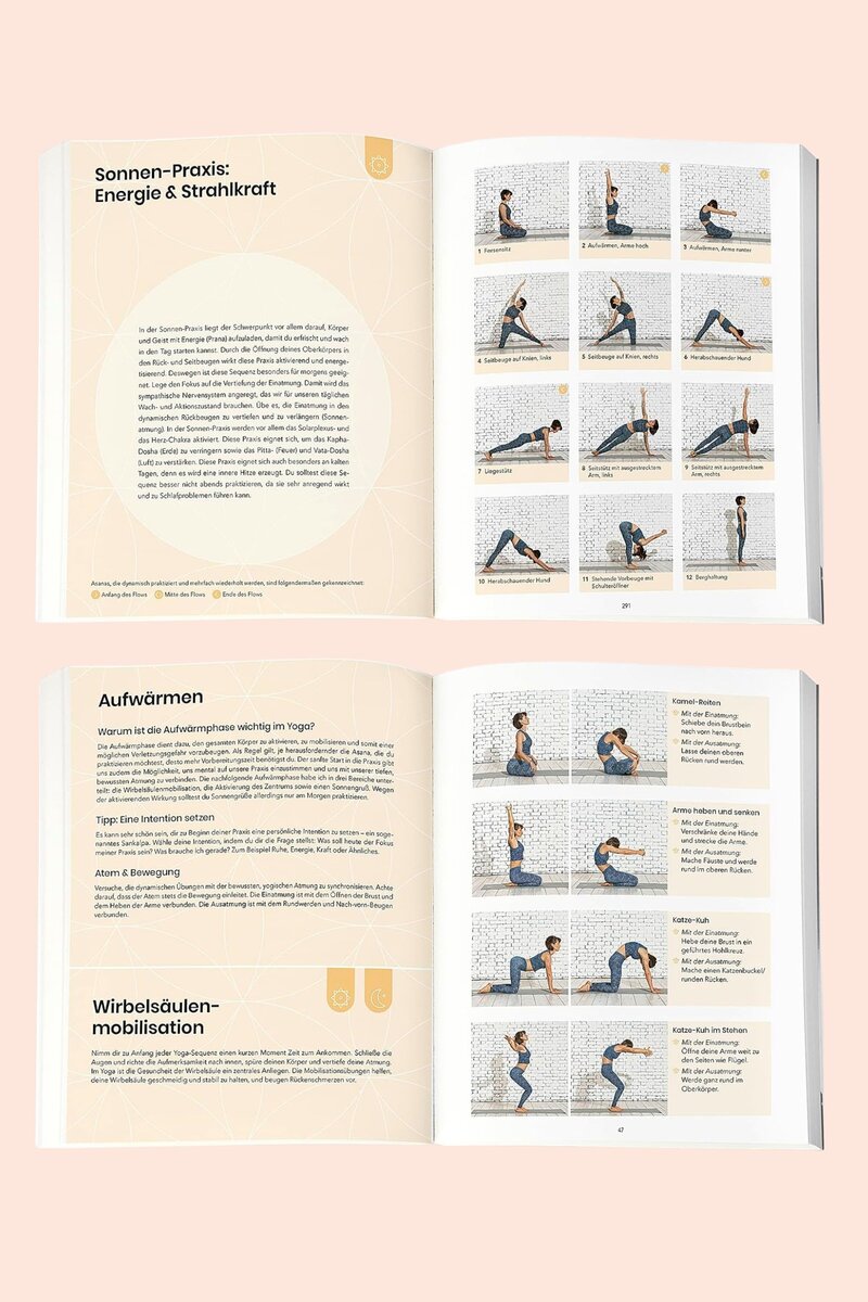 Nach den wundervollen, ausführlichen und trotzdem kurzweiligen Seiten über die Yoga-Geschichte, die Yoga-Arten, Chakren, Ayurveda, einem Dosha-Test und die wundervollen Erklärungen, welches Ziel mit Yoga wirklich verfolgt wird, geht es zu dem Teil der Asanas. Ich liebe besonders, dass hier zu jeder Asana erklärt wird, wie sie wirkt, was sie stärkt, wann man sie ausüben sollte, welche Fehler man machen kann und welche Variationen.